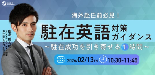 グローバル人材育成・研修業を手掛けるインサイトアカデミー株式会社(本社:東京都港区新橋、代表:金 珍燮)は、無料webセミナー「【海外赴任前必見!】”駐在英語” 対策ガイダンス~駐在成功を引き寄せる1時間~」を開催致します。