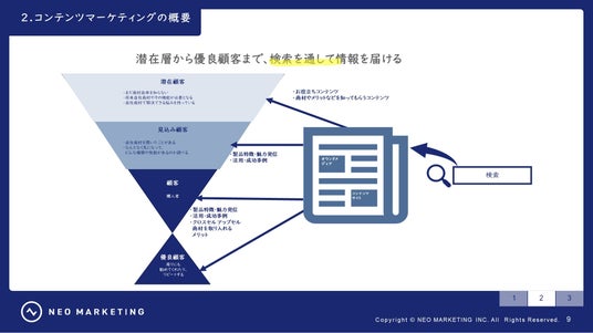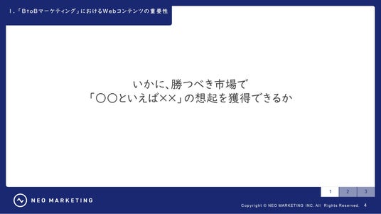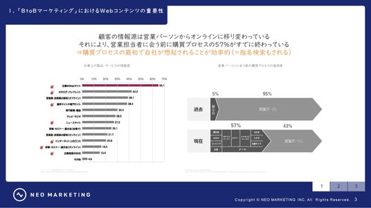 株式会社ネオマーケティング(本社:東京都渋谷区、代表取締役:橋本光伸)は、「BtoBマーケティング」におけるWebコンテンツの重要性」のホワイトペーパー(21ページ)を無料で公開いたしました。本資料は、方法について詳しく解説しています。