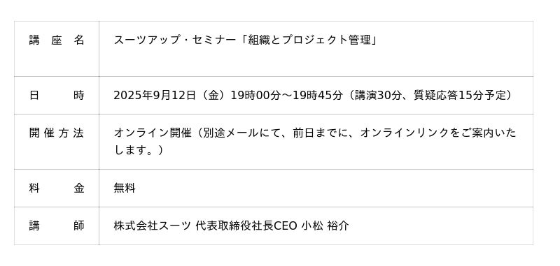 スーツアップ 無料お試しはコチラ1.スーツアップ・セミナー「組織とプロジェクト管理」概要当社では、2025年9月12日(金)19時から、当社代表の小松が講師を務めるスーツアップ・セミナー「組織とプロジェクト管理」を無料開催します。