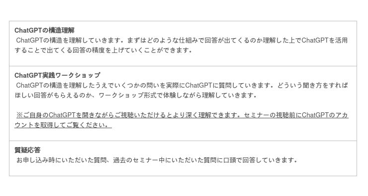 セミナーでは、ChatGPTの仕組みを理解する前と後で、回答の精度が上がるのか、「ChatGPTの構造理解」と「ChatGPT実践ワークショップ」の2本立てでお届けします。