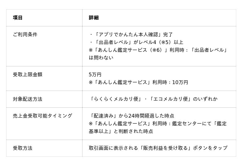 https://about.mercari.com/press/news/articles/20250521_anshinanzen/■概要本機能は、対象の配送方法を利用し、かつ一定の条件を満たした出品者が、取引完了前(受取評価前)に売上金を受け取ることができる機能です。