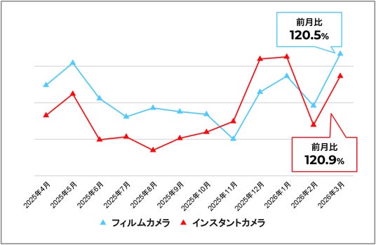 Z世代の2026年3月取引件数は前月比で「インスタントカメラ」120.9%、「フィルムカメラ」120.5%と伸長