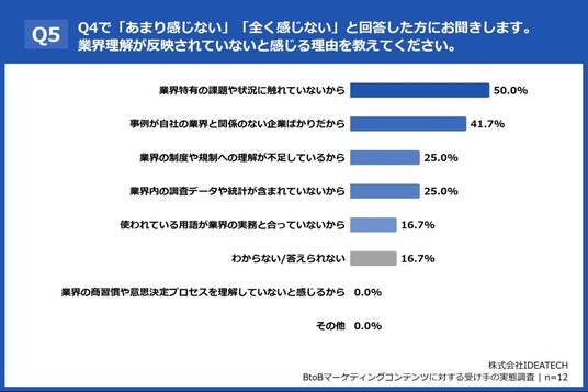 「Q5. Q4で「あまり感じない」「全く感じない」と回答した方にお聞きします。業界理解が反映されていないと感じる理由を教えてください。(複数回答)」(n=12)と質問したところ、