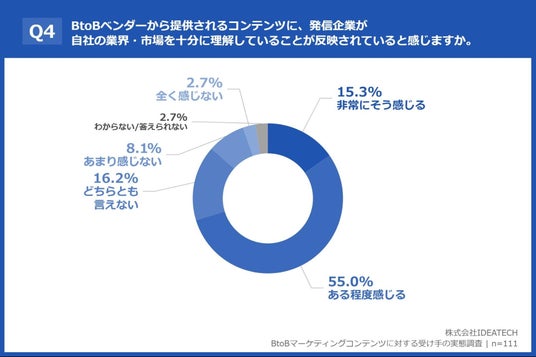 「Q4. BtoBベンダーから提供されるコンテンツに、発信企業が自社の業界・市場を十分に理解していることが反映されていると感じますか。」(n=111)と質問したところ、