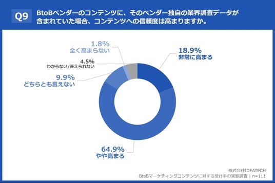 「Q9. BtoBベンダーのコンテンツに、そのベンダー独自の業界調査データ(同業他社の実態や課題を数値化したもの)が含まれていた場合、コンテンツへの信頼度は高まりますか。」(n=111)と質問したところ、