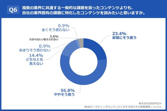 「Q6. 複数の業界に共通する一般的な課題を扱ったコンテンツよりも、自社の業界固有の課題に特化したコンテンツを読みたいと思いますか。」(n=111)と質問したところ、