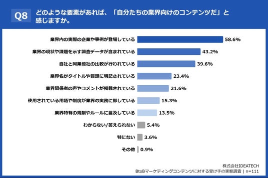 「Q8. どのような要素があれば、「自分たちの業界向けのコンテンツだ」と感じますか。(複数回答)」(n=111)と質問したところ、