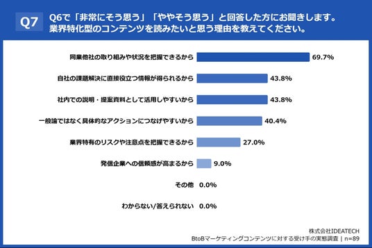 「Q7. Q6で「非常にそう思う」「ややそう思う」と回答した方にお聞きします。業界特化型のコンテンツを読みたいと思う理由を教えてください。(複数回答)」(n=89)と質問したところ、