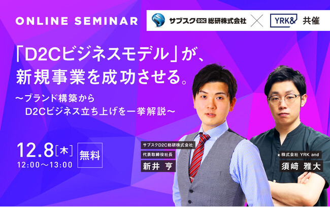 D2C立ち上げ支援を行う、サブスクD2C総研株式会社(本社:東京都豊島区池袋、代表取締役社長:新井亨)は、創業127年目のブランドコンサルティング会社、株式会社 YRK and(本社:大阪市中央区、代表取締役社長:中許 将一)と共催セミナーを開催。