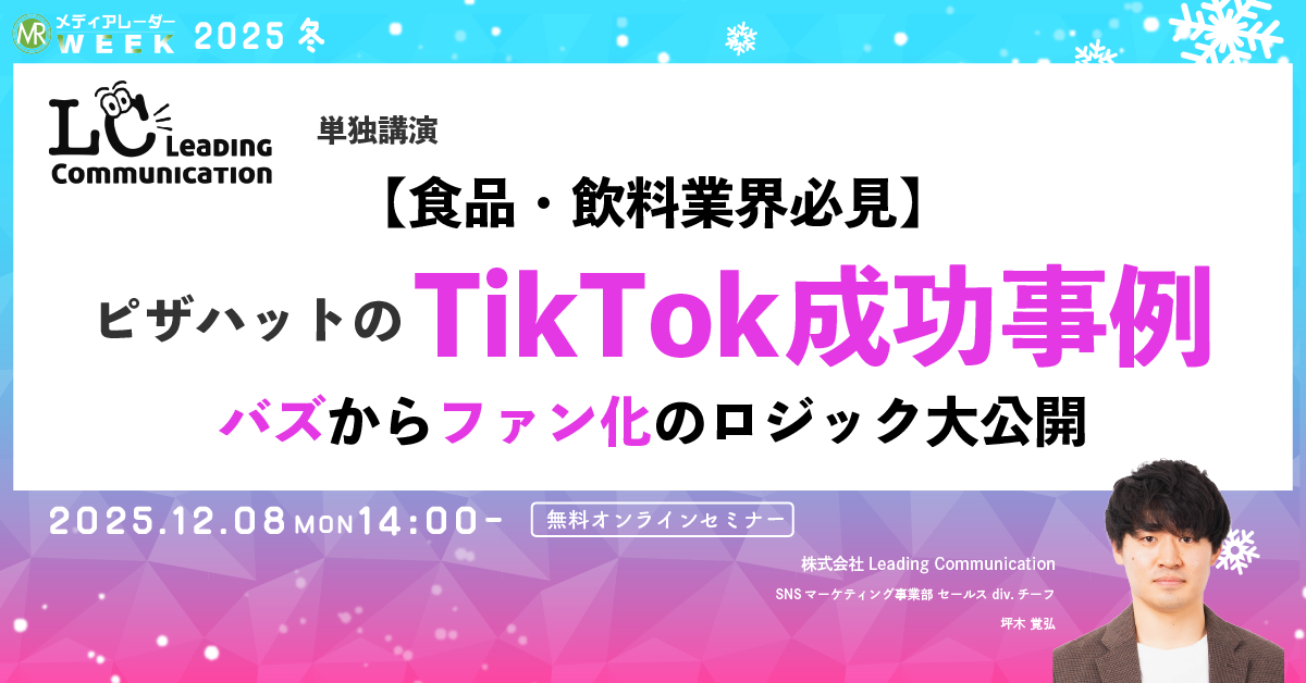 株式会社アイズ(所在地:東京都渋谷区、代表取締役社長:福島範幸、東証グロース:5242)が運営するNo.1*の広告業界のプラットフォーム「メディアレーダー」が主催するマーケティングセミナーイベント「第20回メディアレーダーWEEK 2025 冬」にて、株式会社Leading Communication様が12/8(月)に登壇します。視聴申し込みは無料です。
