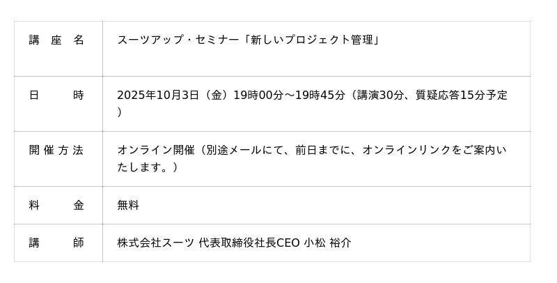 スーツアップ 無料お試しはコチラ1.スーツアップ・セミナー「新しいプロジェクト管理」概要当社では、2025年10月3日(金)19時から、当社代表の小松が講師を務めるスーツアップ・セミナー「新しいプロジェクト管理」を無料開催します。