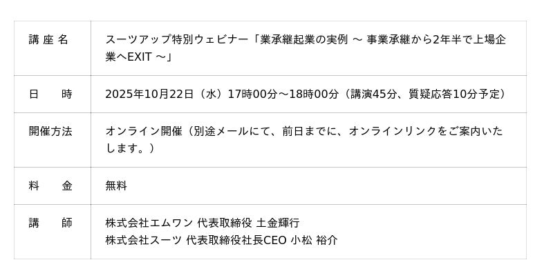 株式会社スーツ(所在地:東京都千代田区、代表取締役社長CEO:小松 裕介)は、2025年10月22日(水)17時から、ゲスト講師に、株式会社エムワン 代表取締役 土金輝行氏を迎え、第18回となるスーツアップ特別ウェビナー「業承継起業の実例 ~ 事業承継から2年半で上場企業へEXIT ~」を無料開催します。