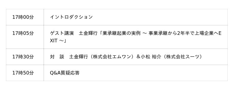 1.スーツアップ特別ウェビナー「業承継起業の実例 ~ 事業承継から2年半で上場企業へEXIT ~」概要当社では10月22日(水)17時から、ゲスト講師に、株式会社エムワン 代表取締役 土金輝行氏を迎え、第18回目となるスーツアップ特別ウェビナー「業承継起業の実例 ~ 事業承継から2年半で上場企業へEXIT ~」を無料開催します。