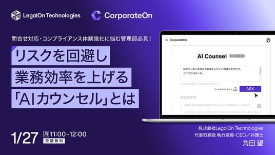 株式会社LegalOn Technologies(本社:東京都渋谷区 代表取締役 執行役員・CEO:角田 望)は、2025年1月27日(月)11時より、代表取締役 執行役員・CEO/弁護士の角田が登壇するオンラインセミナー『【問合せ対応・コンプライアンス体制強化に悩む管理部必見!】リスクを回避し業務効率を上げる「AIカウンセル」とは』を開催いたします。