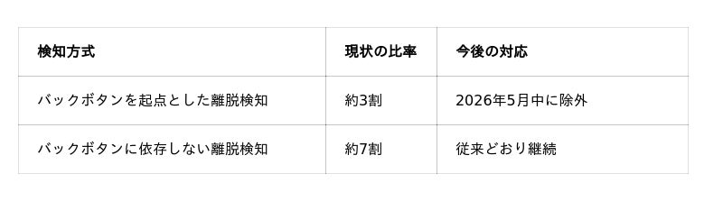 N1テクノロジーズは2023年頃より、バックボタンに依存した離脱防止手法のユーザー体験上の課題を認識し、代替技術の開発を進めてきました。現在、SiteLeadにおけるポップアップ表示の約7割はすでにバックボタン非依存技術によって実現しており、残りの約3割についても5月中の改修をもってポリシー適合仕様へ完全移行します。