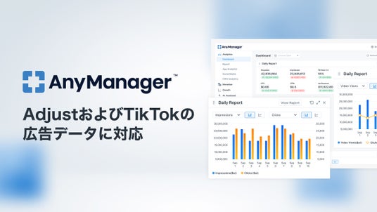 AnyMind Group株式会社(読み:エニーマインドグループ、代表取締役CEO:十河 宏輔、以下「当社」) のメディア・モバイルアプリグロースプラットフォーム「AnyManager」のユーザー獲得広告分析機能」において、モバイルアナリティクスプラットフォーム「Adjust」とショート動画プラットフォーム「TikTok」とデータ連携を新たに開始しました。