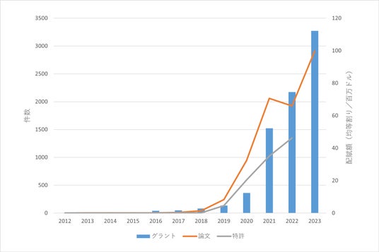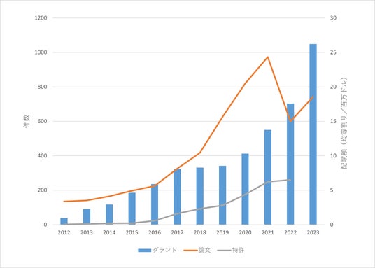 グラントの配賦額はプロジェクト期間で均等割りにして、各年に再配分した値で集計しています。たとえば、配賦額が3万ドルで実施期間が3年の場合、各年に1万ドルを計上しています。ただし、中国はグラントの開示状況が年によって大きくことなり、実態を反映しているとはいえないため、集計から除外しています。また、特許に関しては、出願から公開まで1年6ヶ月が経過するため、2012年から2022年までの期間で集計しています。