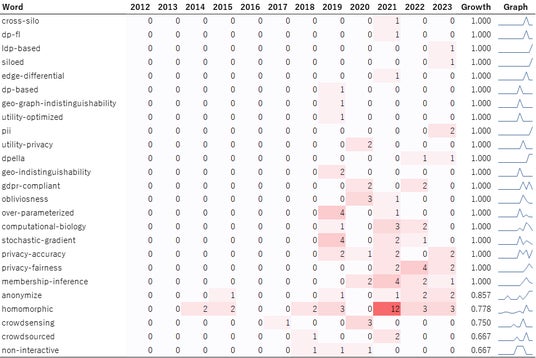 図4から、「geo-graph-indistinguishability」、「pii」、「geo-indistinguishability」、「membership-inference」、「anonymize」、「crowdsensing」、「crowdsourced(data annotation)」などの個人情報保護やプライバシー保護に直結したキーワードが見受けられます。また、「dpella」、「gdpr-compliant」など、同分野にとりくむ具体的なスタートアップ企業名や、個人情報の保護に資する規則(GDPRは欧州連合内で個人データの保護を強化し、統合することを意図した規則)に関連するキーワードも確認できます。これにより、差分プライバシーが個人情報保護やプライバシー保護の分野で高い需要があることが示唆されます。