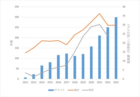 図3:差分プライバシーに関連する論文や特許の件数およびグラントの配賦額年次遷移