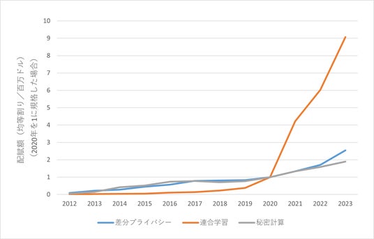 図7、図8、図9から、秘密計算、差分プライバシー、連合学習の論文や特許の件数およびグラントの配賦額を比較すると、秘密計算と差分プライバシーがゆるやかな増加傾向をしめす一方で、連合学習は2018年以降、著しい増加率をしめしていることがわかります。とくに、2020年を基準にすると、連合学習の2023年の論文件数は約3.1倍、特許件数は約2.3倍、グラントの配賦額は約9倍に達しています。