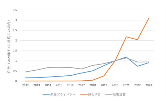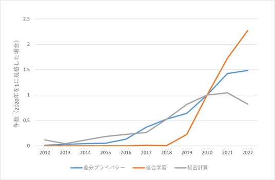 また、秘密計算と差分プライバシーを比較すると、差分プライバシーのほうが増加率がわずかに大きく見えます。これは、それぞれの技術の歴史の長さで説明でき、秘密計算の歴史は1970年代、差分プライバシーは2000年代、連合学習は2010年代にはじまっています。、古い技術ほど近年の増加率が小さいのは自然な流れです。しかし、いずれの技術も継続的な成長をしめしており、研究開発が活発的におこなわれている分野であることに変わりはありません。