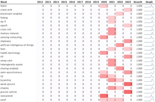 図6:連合学習に関連するグラントのタイトルや概要にふくまれる特徴的なキーワードの年次推移