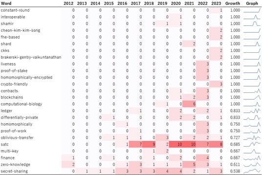 図2から、「proof-of-stake」、「contracts」、「blockchains」、「proof-of-work」、「finance」などの金融や暗号通貨に関連したキーワードや、「shard(-x)」、「ledger」などの同分野にとりくむ具体的なスタートアップ企業名が見受けられます。このことから、秘密計算の応用先としておもに金融や暗号通貨が模索されていることがあきらかとなり、スタートアップ企業名が登場していることをふまえると、秘密計算は実用化に近い段階にあると推測されます。