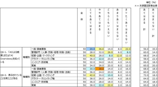 なお、「AIによる概要」または「AI Overviews」を見たことがあるかどうかについては、「あてはまる 計」で、すべての職種で6割を超えた。