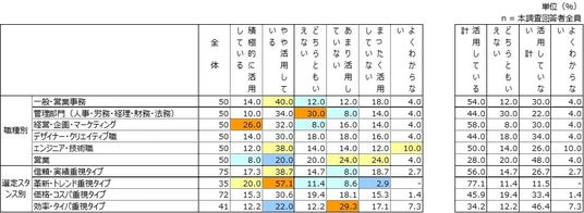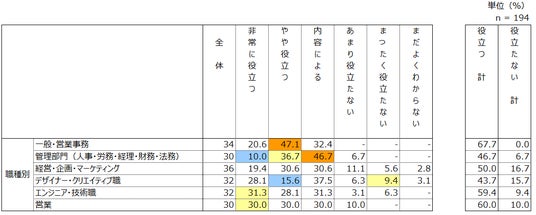「非常に役立つ」と「やや役立つ」を「役立つ 計」とすると、デザイナー・クリエイティブ職(約44%)を除いた職種で過半数をそれぞれ超えた。TOPは一般・営業事務の約68%となり、2位の営業60%と約8ptの差があった。