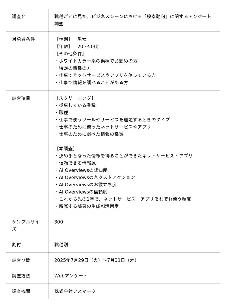 そういった変化がある状況を受け、今回は多岐にわたる職種の方々が、仕事で使うツールやサービスを決定する際の情報源、信頼できると感じる情報源、「AIによる概要(AI Overviews)」の認知度などが異なるのか調査しました。
