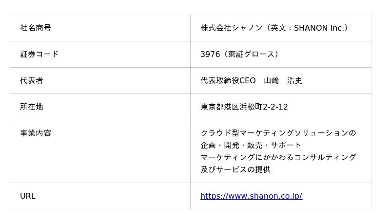 ■株式会社シャノンについてシャノンは、クラウドテクノロジーをコアに、企業のマーケティング課題を解決する製品・ソリューション・サービスを提供しています。デジタルとアナログを組み合わせるデジアナマーケティングなどを実現し、イベント、セミナー、マーケティングオートメーション、CMSまで提供するシャノンのマーケティングクラウドは、製造業、金融、不動産、ITサービス、商社や公共団体など業種を問わず、大規模から中小規模まで多様なシーンでご利用いただいています。