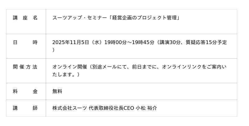 スーツアップ 無料お試しはコチラ1.スーツアップ・セミナー「経営企画のプロジェクト管理」概要当社では、2025年11月5日(水)19時から、当社代表の小松が講師を務めるスーツアップ・セミナー「経営企画のプロジェクト管理」を無料開催します。