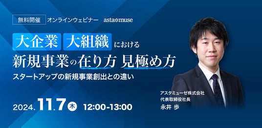 アスタミューゼ株式会社(本社:東京都千代田区、代表取締役社長 永井歩)は、2024年11月7日(木)12:00-13:00に、経営企画・事業戦略担当者、新規事業担当者向けの無料ウェビナー「大企業・大組織における新規事業の在り方・見極め ~スタートアップの新規事業創出との違い~ 」開催します。