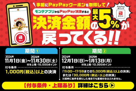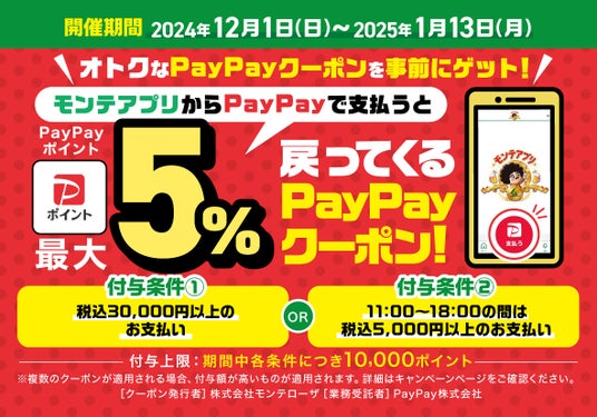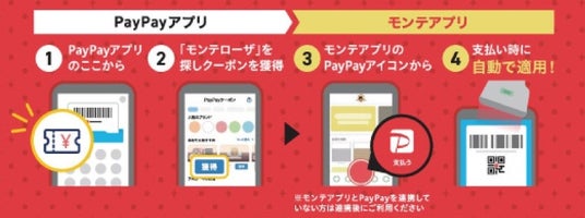 事前にPayPayアプリ上でクーポンを獲得のうえ、対象店舗をご利用のお会計時にモンテアプリのPayPay決済をご利用いただくと、決済金額の最大5%のPayPayポイントが後日付与されます。
