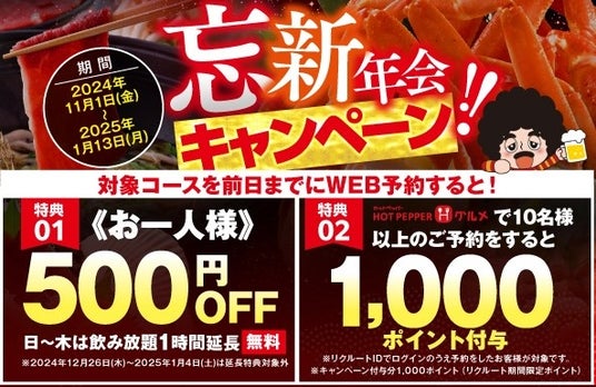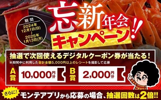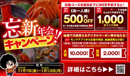 株式会社モンテローザ(本社:東京都杉並区、代表取締役:大神輝博)は、日頃のご愛顧に感謝し、2024年11月1日から2025年1月13日までの期間、全国の当社店舗で「忘新年会キャンペーン」を開催します。