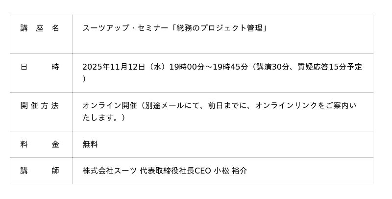 スーツアップ 無料お試しはコチラ1.スーツアップ・セミナー「総務のプロジェクト管理」概要当社では、2025年11月12日(水)19時から、当社代表の小松が講師を務めるスーツアップ・セミナー「総務のプロジェクト管理」を無料開催します。