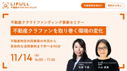 事業を通して社会課題解決に取り組む株式会社LIFULLのグループ会社である株式会社LIFULL Investment(本社:東京都千代田区、代表取締役社長:市川和也)は、2024年11月14日(木)16:00より、宅建事業者様向けの不動産クラウドファンディングセミナーを開催いたします。