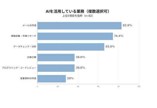 約6割が「業務時間50%以上短縮」、生産性・成果物の質ともに大幅向上AIを活用している業務は多岐にわたり、メールの作成や情報収集、データチェックや分析業務など、社員は日常のあらゆる業務にAIを活用しています。