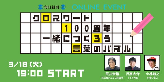 毎日新聞社(代表取締役社長:松木健)は3月18日(火)19時から、オンラインイベント「クロスワード100周年『一緒につくろう 言葉のパズル』」を開催します。クロスワードが日本で初めて掲載されたのは「サンデー毎日」で1925(大正14)年のこと。今年で100年になることから、クロスワードの歴史や裏話を紹介するトークイベントです。参加者と一緒に縦横のヒントづくりにチャレンジするコーナーも用意しています。お楽しみに!