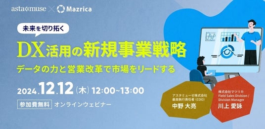アスタミューゼ株式会社(本社:東京都千代田区、代表取締役社長 永井歩)は、2024年12月12日(木)12:00-13:00に、株式会社マツリカ(本社:東京都中央区、代表取締役CEO:黒佐 英司)と共同で、新規事業担当者に向けた無料ウェビナー「未来を切り拓くdx活用の新規事業戦略~データの力と営業改革で市場をリードする~」を開催いたします。