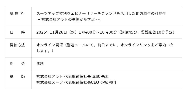 株式会社スーツ(所在地:東京都千代田区、代表取締役社長CEO:小松 裕介)は、2025年11月26日(水)17時から、ゲスト講師に、株式会社アラト 代表取締役社長 赤塚 亮太氏を迎え、第20回となるスーツアップ特別ウェビナー「サーチファンドを活用した地方創生の可能性~ 株式会社アラトの事例から学ぶ ~」を無料開催します。