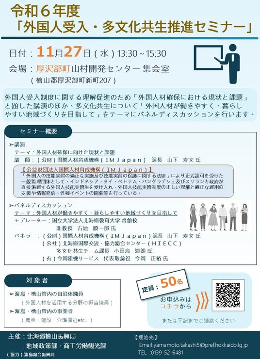 本セミナーは、人口減少や少子高齢化の進行などにより、幅広い産業分野で人手不足が深刻化するなど、今後、外国人材の受入が求められる道南地域において、外国人の受入促進に関する制度理解や地域における多文化共生の推進のほか、実際に外国人の方たちが就労している分野は各市町によって農業・建設・福祉・水産など様々であり、そのような自治体間や分野間の垣根を越えた繋がりの構築が期待されます。