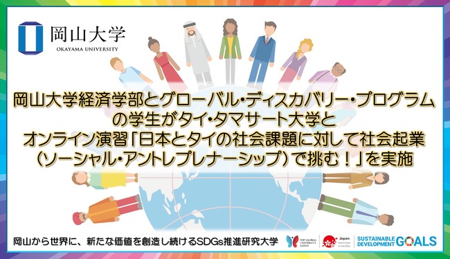 国立大学法人岡山大学(本部:岡山市北区、学長:槇野博史)経済学部は、2022年3月1日から29日にかけて、経済学部海外特別演習としてタイのタマサート大学グローバル・スタディーズ学部(School of Global Studies, Thammasat University)とオンラインで「日本とタイの社会課題に対して社会起業(ソーシャル・アントレプレナーシップ)で挑む!」を開催しました。岡山大学の経済学部生10人、グローバル・ディスカバリー・プログラム生8人、タマサート大学の学生54人が参加しました。