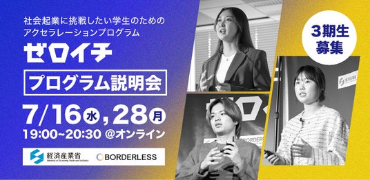 株式会社ボーダレス・ジャパン(本社:福岡県福岡市、代表取締役CEO:田口一成、代表取締役COO:鈴木雅剛)が運営する、経済産業省の学生向け社会起業家アクセラレーションプログラム 「ゼロイチ」 は、社会課題の解決を志す学生(18 歳以上)を対象に、第3期生となるプログラム参加者の募集を本日より開始します。