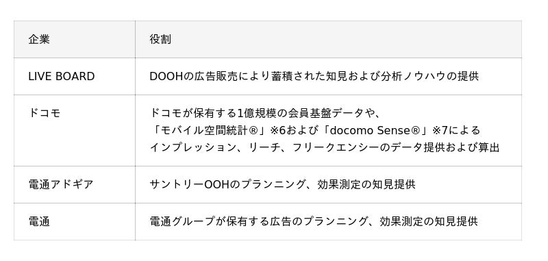 株式会社LIVE BOARD(以下、LIVE BOARD)、株式会社NTTドコモ(以下、ドコモ)、 株式会社電通アドギア(以下、電通アドギア)、株式会社電通(以下、電通)は、2024年10月1日(火)から2025年7月31日(木)の期間でサントリーホールディングス株式会社(以下、サントリー)が出稿したアナログ交通・屋外広告(Out of Home、以下、OOH)を対象に、デジタル交通・屋外広告(Digital Out of Home、以下、DOOH)のインプレッション※1、リーチ※2、フリークエンシー※3等の指標を 応用して、広告価値の効果測定を行う実証実験(以下、本実証実験)を行い、OOHの広告価値の 可視化を実現しました。