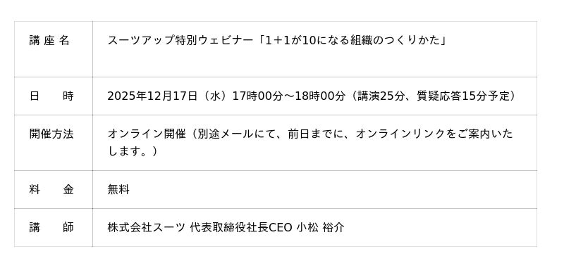 株式会社スーツ(所在地:東京都千代田区、代表取締役社長CEO:小松 裕介)は、2025年12月17日(水)17時から、当社代表取締役社長CEO 小松 裕介による、2025年最後の開催となる第21回スーツアップ特別ウェビナー「1+1が10になる組織のつくりかた」を無料開催します。
