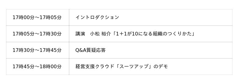 1.スーツアップ特別ウェビナー「1+1が10になる組織のつくりかた」概要当社では12月17日(水)17時から、講師に、当社代表取締役社長CEO 小松 裕介による、2025年最後の開催となる第21回スーツアップ特別ウェビナー「1+1が10になる組織のつくりかた」を無料開催します。