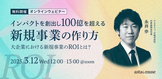 アスタミューゼ株式会社(本社:東京都千代田区、代表取締役社長 永井歩)は、2025年3月12日(水)12:00-13:00に、新規事業担当者、経営企画担当者向けの無料ウェビナー「インパクトを創出し100億を超える新規事業の作り方 ~大企業における新規事業のROIとは?~」を開催いたします。1月に開催したウェビナーの再開催となります。