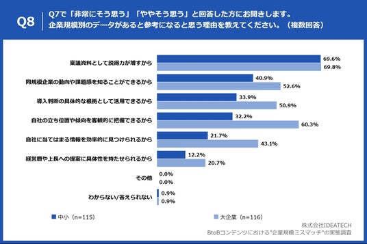「Q8. Q7で「非常にそう思う」「ややそう思う」と回答した方にお聞きします。企業規模別のデータがあると参考になると思う理由を教えてください。(複数回答)」と質問したところ、中小(n=115)は