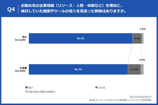 https://ideatech.jp/service/research-pr 「Q1. 過去1年間で、業務で利用する製品やサービスに関する資料を読んでいて、「自社の企業規模には合っていない」と感じ、読むのを途中でやめたことはありますか。」と質問したところ、中小(n=124)は